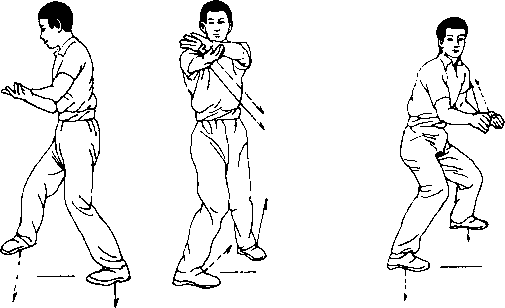 左脚向左后退一大步,右脚随之讴步,再心略降低,面向东 南成双扣步。同时左肘里靠,前臂略外旋,掌指均屈,退肘时左 下拉按掌;右臂内旋,使掌心朝序 掌指均屈,收肘向左拉按掌, 两掌均在左腰前,右掌在前,左掌在后,两掌心均朝下。眼视正 南。(图 3—64)