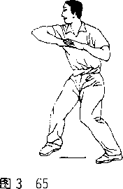 右脚朝南进一步,左脚跟上-步,面向东南成双扣步。同时 右臂里屈,抬肘,朝南前顶;左肘略抬,两肘齐肩高,两掌心均 朝下,左掌心按压于右掌面上。眼视止南。(图3-65)