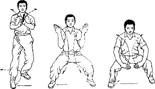 (2) 上动不停,脚步不变.两臂内旋,两掌里靠,使小指一 侧朝下,掌心朝后猛力向裆下切按。眼看两掌。(图4- 4②)