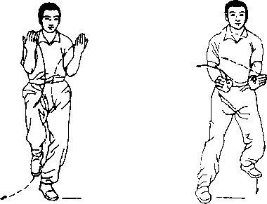 技击要领:借右脚侧出步之惯性抖臂发力,防可挑开对方正 面攻来的拳掌;攻可甩击对方胸腹部。若对方起脚正面踢来,我 立即用双掌向下切按。