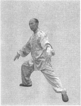 身体继续右转下松,左脚同时向左前顺地滑蹬而出一步,成
