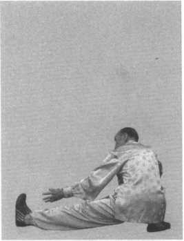 双掌齐向右侧后上提倒卷的同 时,重心移至右腿;右掌倒卷 至身右侧,左掌后撤,沿中线 向上至脸前倒卷展伸拍击而 下;左腿同时直仆于地,右腿 连膝着地;左掌拍落至左小腿 内侧,掌心朝上(图8-291)。