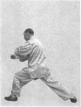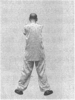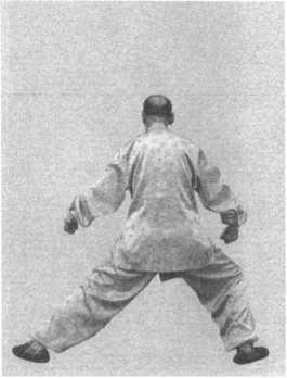 右掌继续向左臂前下方戳滚的同时,左掌向内旋滚,双掌同 时变拳,向左右两侧横开,两拳心相对;重心移中成马步(图
