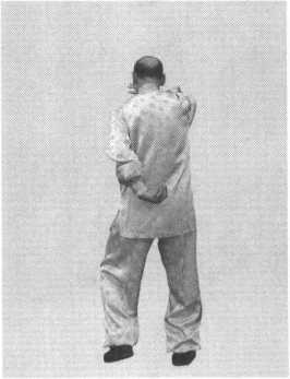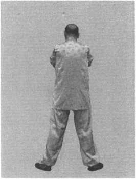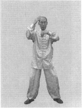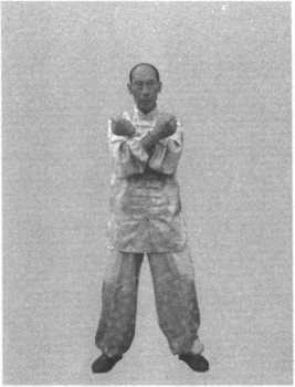 接上式。身体向上长伸 时,双拳一齐上提,向内合 抱相冲而过成十字交叉;同 时右脚向左收三分之一步 (图 8-295、图 8-295 附图)。