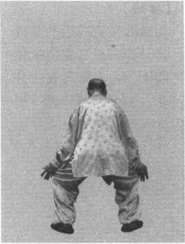 身体重心下沉松,双拳变 掌,顺胸前下落至裆,同时再 向左右分开外旋至膝前,掌指 朝前(图8-296 )□