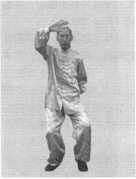 身体上起伸展,双掌同时 上托而起,向内旋合后,左掌 变勾手,下栽绕至身后腰脊 处,右掌亦同时向前推按而 出,掌心朝前;左脚同时向右 收三分之一步。两脚距离同肩 宽。上下周正,立身平衡,谓 之双跨虎势。(图8-297、图 8-297 附图、图 8-298、图 8- 298附图)。