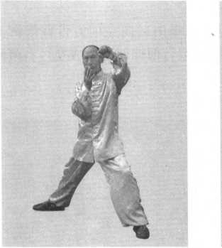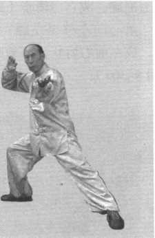 诀曰:敌人若把我臂拿,滚臂应变开弯弓。左搠右扣反制敌,连环掌发穿敌胸。接上式。重心向后移至右腿,成右弓箭步;同时双拳变掌, 左掌前伸撑滚,掌心朝上;右掌同时后拉,掌心朝右外,如开弓 势(图 8-305、图 8-306 )o图 8-305图 8-306图 8-307图 8-307图 8-307图 8-307继而在右掌向前返推冲出 的带动下,身转成面南背北, 重心移至左腿,右腿一弹跟 上,与左脚相齐而立;左掌同 时向下外旋腕后和右掌滚翻向 前按出,同时完成弯弓射虎 势,双掌心朝前,双臂微屈 (图 8-307 )o
