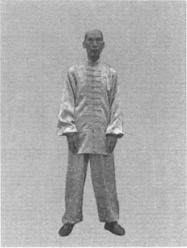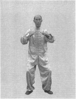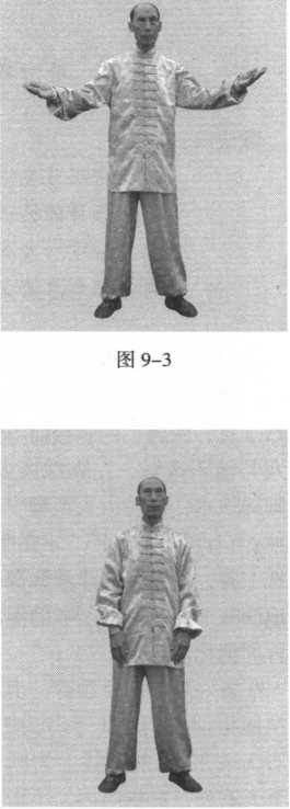 图9-1图9-1准备好后,两手领臂,由左 右两腿根前变阴掌(手背为阳, 手心为阴),沿两侧往上划圆环 抱至天庭处,拇指向内,小指朝 前,经胸前下降回于腿根。起势 成。(图 9-1 ~图 9-5)