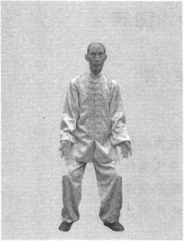 面南背北,两脚的距离与肩同宽,正头领神,项要直起不可 用力,轻轻支撑以减轻头对身体的压力;同时,沉肩坠肘,两臂 自然垂直,两胯、两膝松而不懈,两脚十趾抓地,脚底放平,涌 泉穴与地阴接触,左脚踩离火, 右脚踩坎水,保持由头至脚中正 不偏;口亦同时合上,牙要叩, 舌抵上腭,使循环的津液源源不 断地润喉下胃,有助于喉的湿润 和胃的消化。