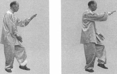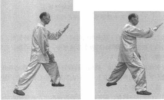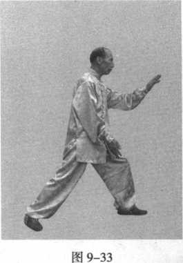 随即左掌领臂中起,向左前方带步推出,掌心朝前,成左弓 右蹬步;右掌随势划弧从右侧下旋落于裆前(图9-29 ~图9-33 )。