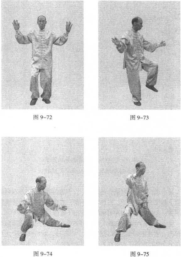 歌诀曰:二郎担山把势下,两掌翻分施擒拿。攻敌下盘扫趟腿,身旋脚到连根拔。接上式。在童子拜祖的基础上,合十的两掌同时向左右两侧 外往上划弧而展臂劈下;右膝随势下落,右脚着地,重心转换右 脚下蹲;左腿亦同时向左后侧滑蹬而出(此谓下势)。接着两手同时领臂内旋上撩;身体重心随两臂运动之际向左 腿转换;右手同时领右脚向左前方一扫而过,约转体180。,左 手在上,掌心向前;右手在下,位于右腿根处,掌心亦向前(图 9-72 ~ 图 9-77 )□