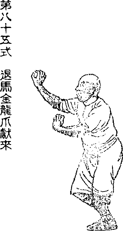 左脚箭步.成虎扑势;接着右掌变爪运下抓裆;左掌化 爪向上划面(如图),〉同时□喝“晔”一声口