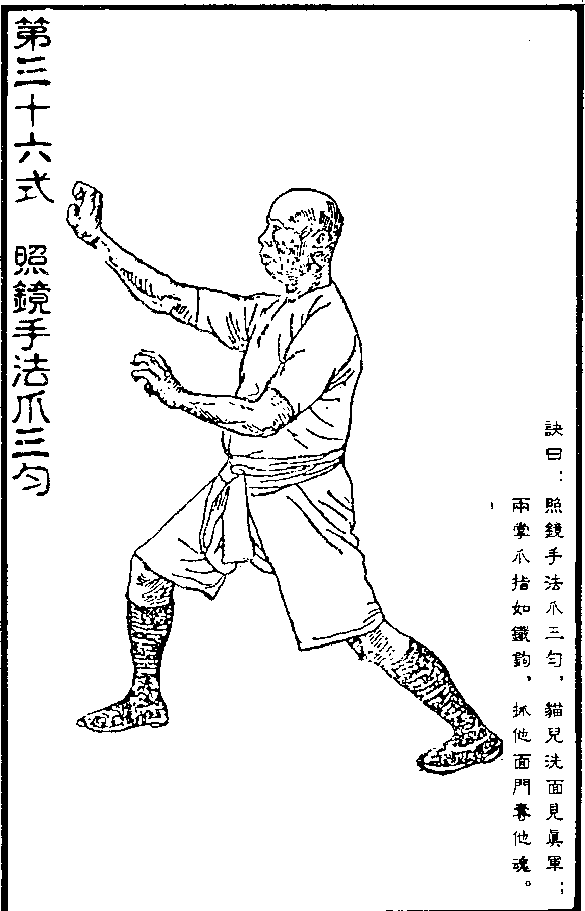 【拆门解义】参见第十七式"此时若敌一拳打至,我可 立变弓箭步,顺「变爪上抓其面"