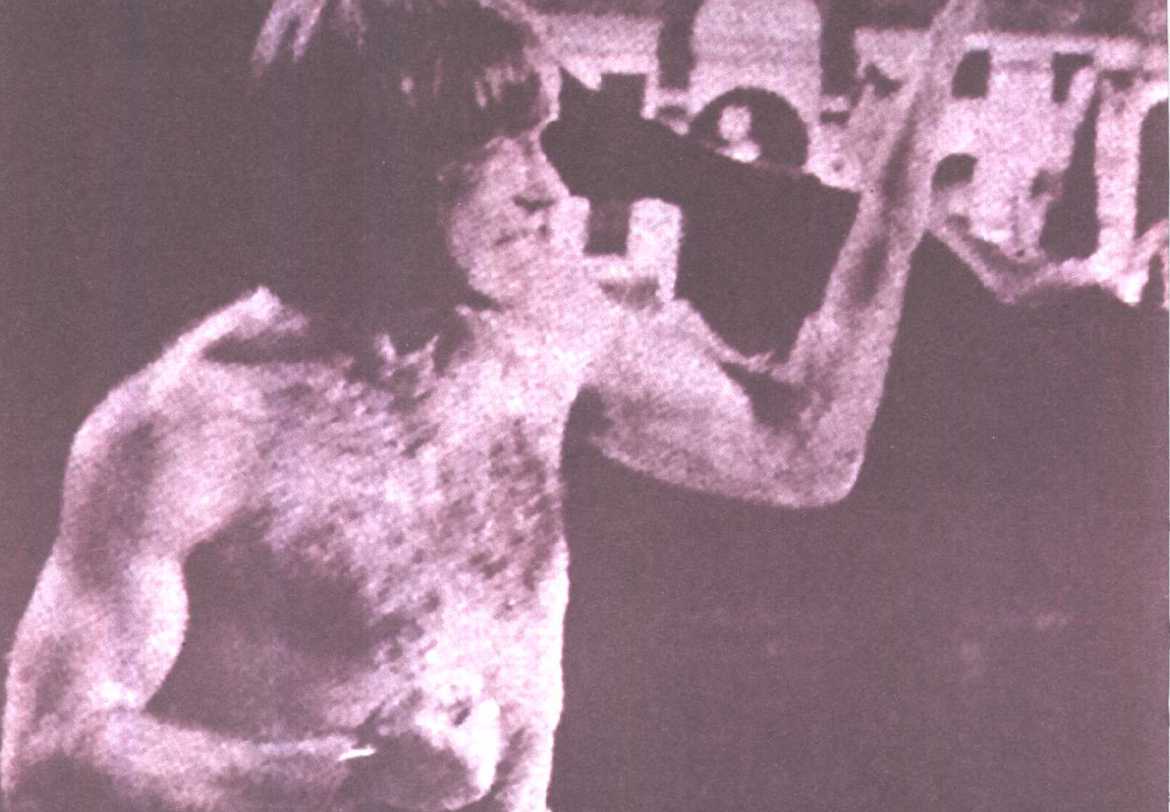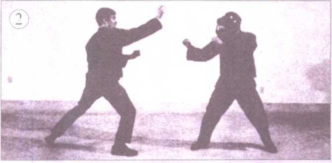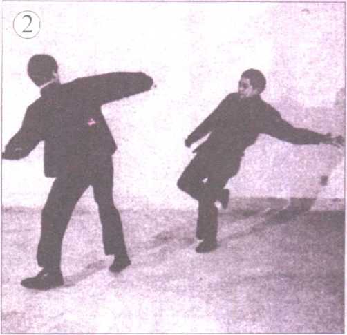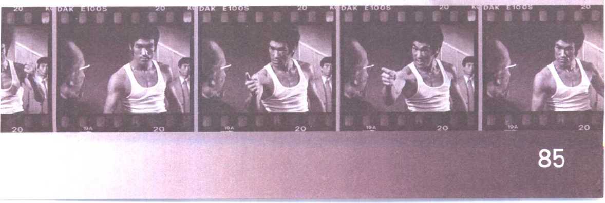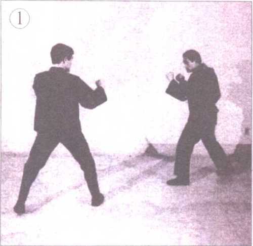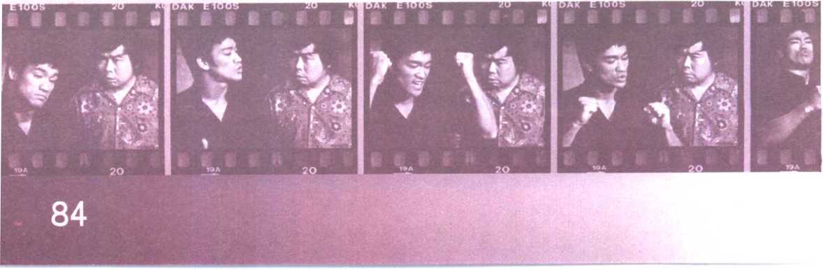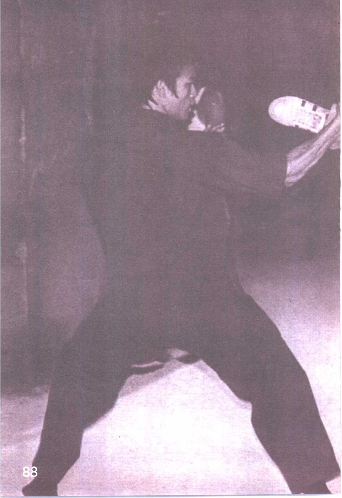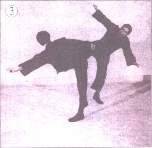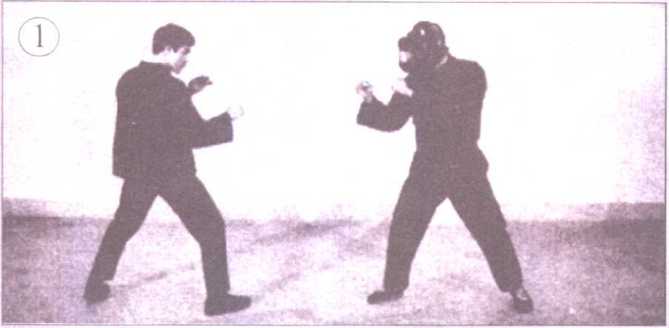 (1)至⑶,李小龙示范以一记中段侧踢。他先提手佯攻,趁对手下意 识地提手露出中段空当时,马上以一记中段侧踢击向对方肋骨位置。