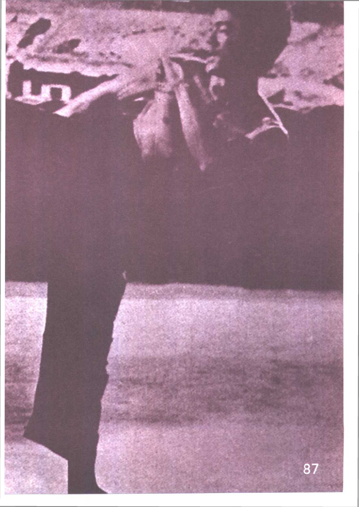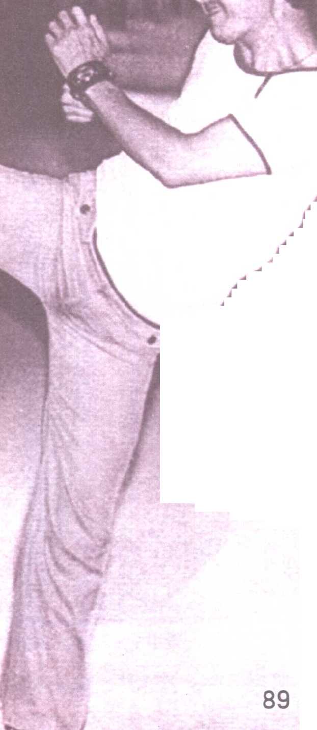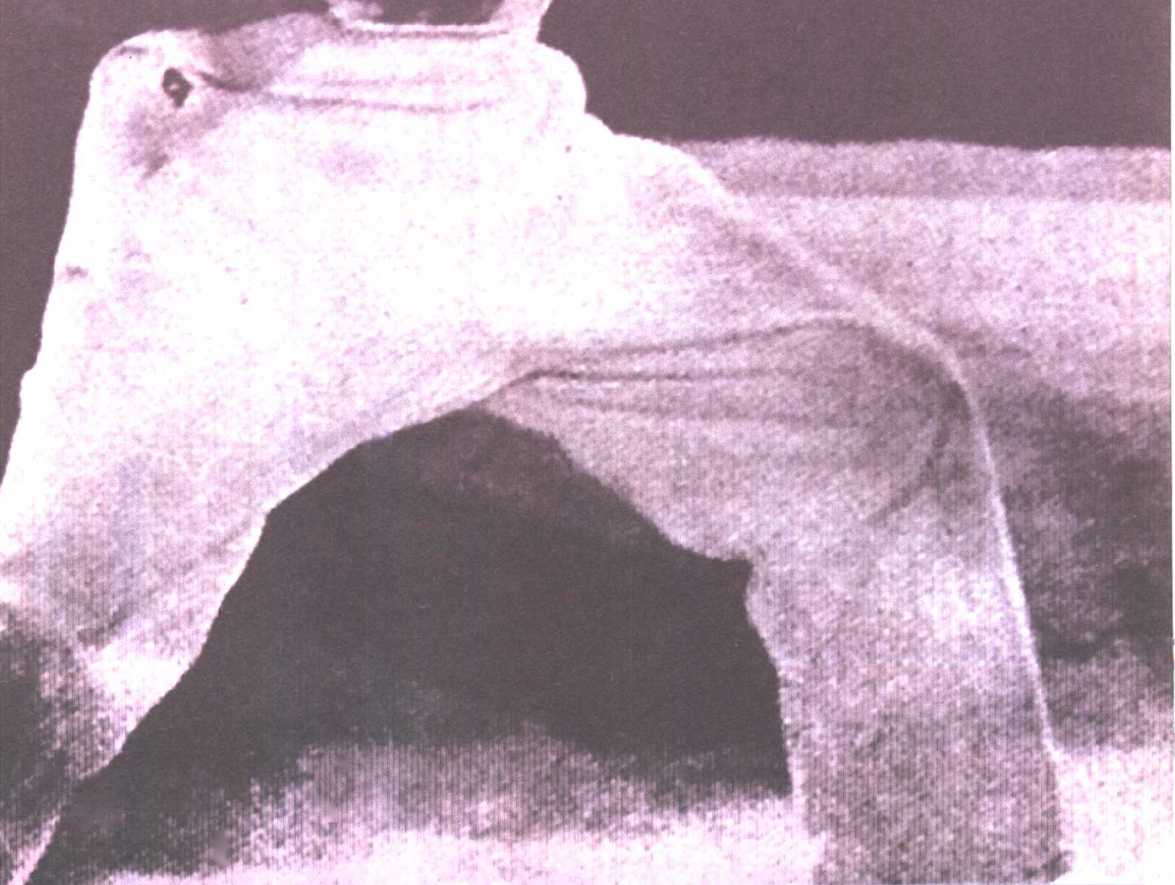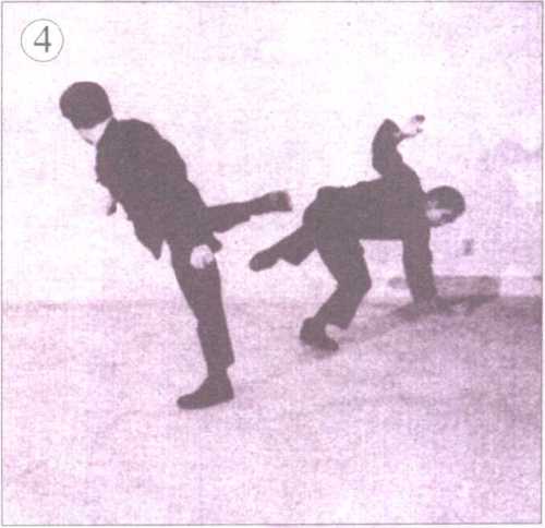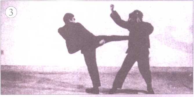 ⑴至⑷,当对手冲前欲以攻击时,可以乘着他迎面的冲力还以一记 稍偏高的中段侧踢,产生人仰马翻的震憾威力。