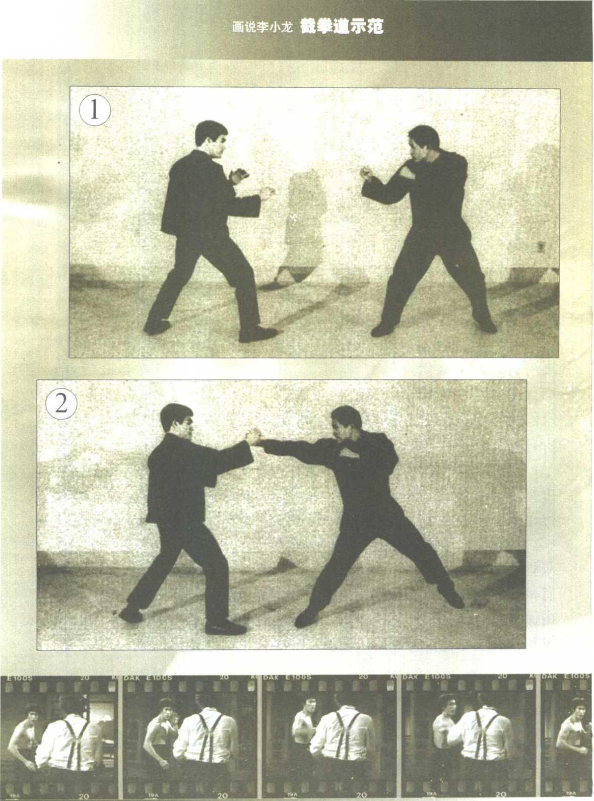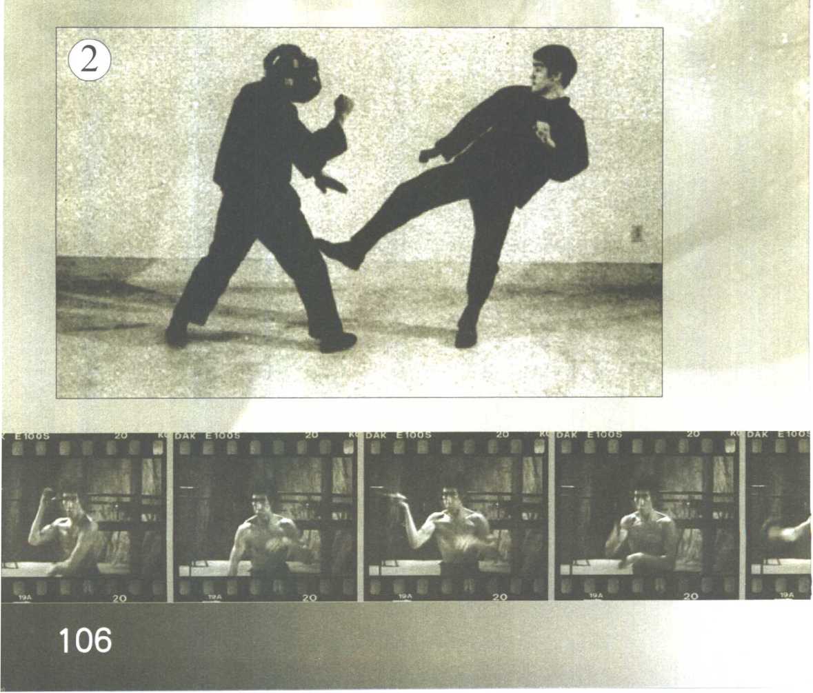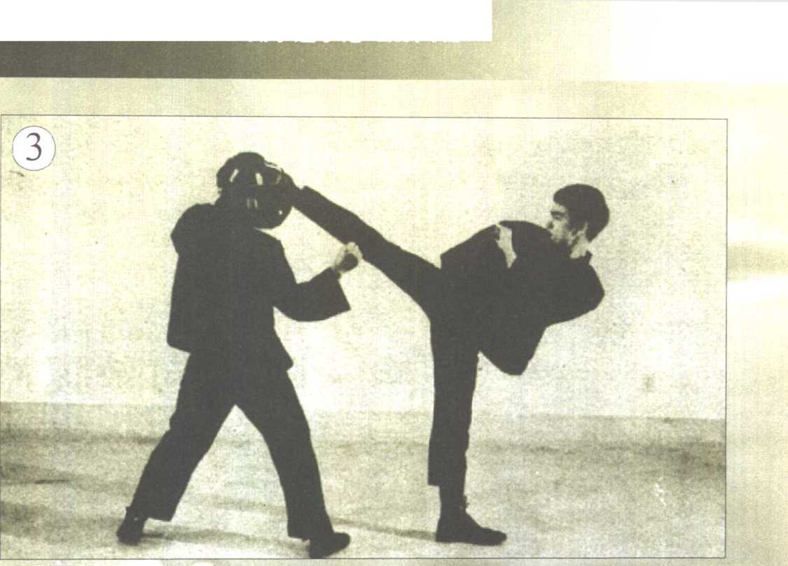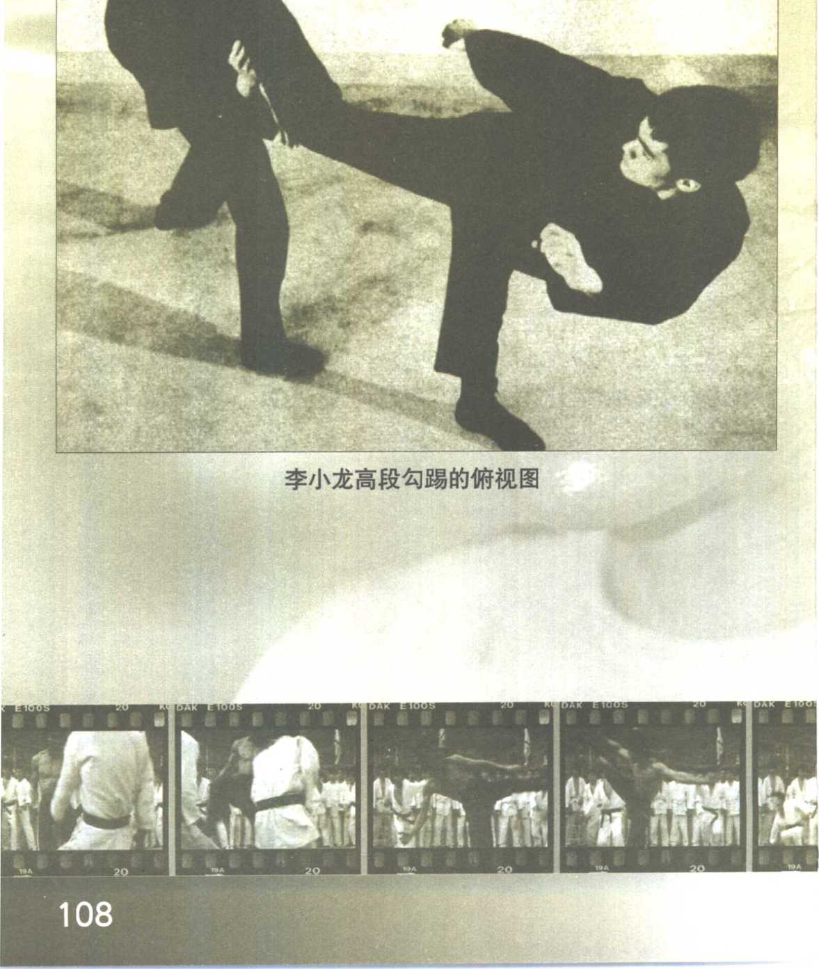 (1 )至(3 ),李小龙示范以一记勾踢。他先以一记假的低踢作佯攻, 然后突然改变方向往高处踢,对手头部中招。