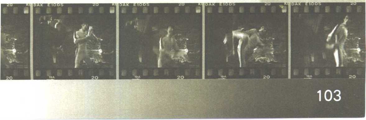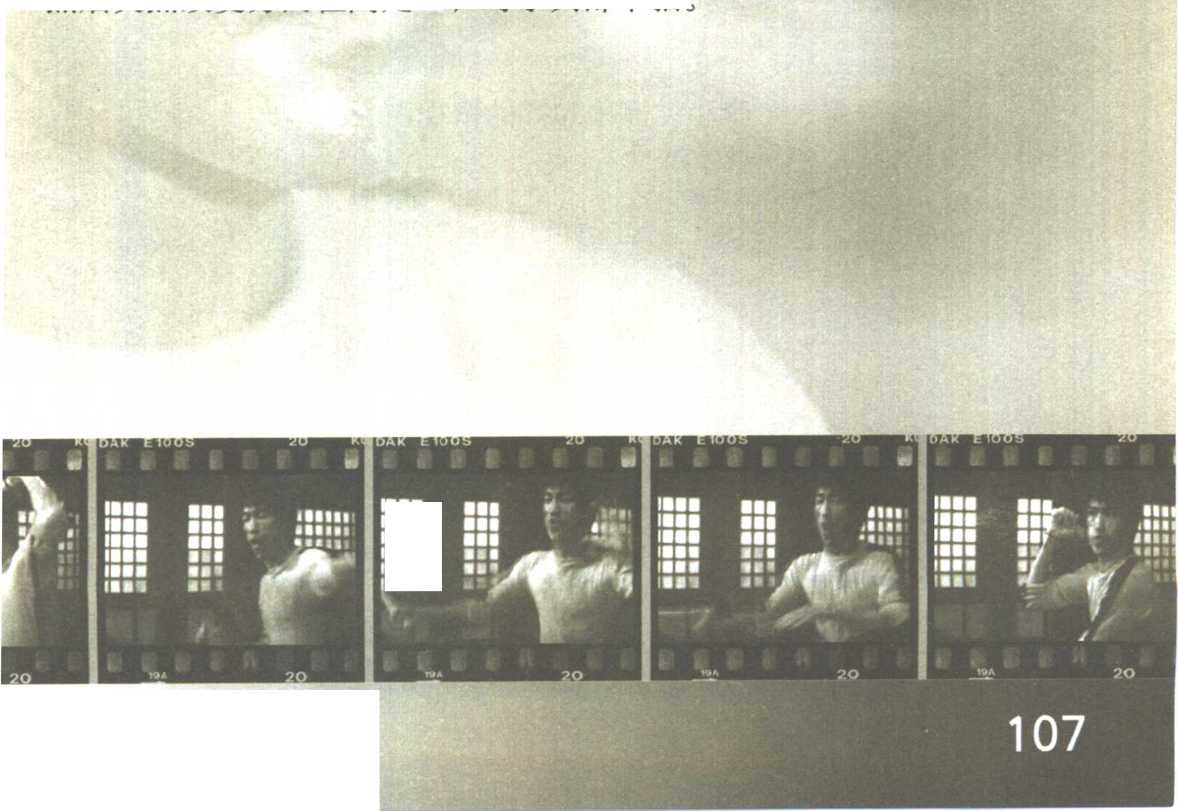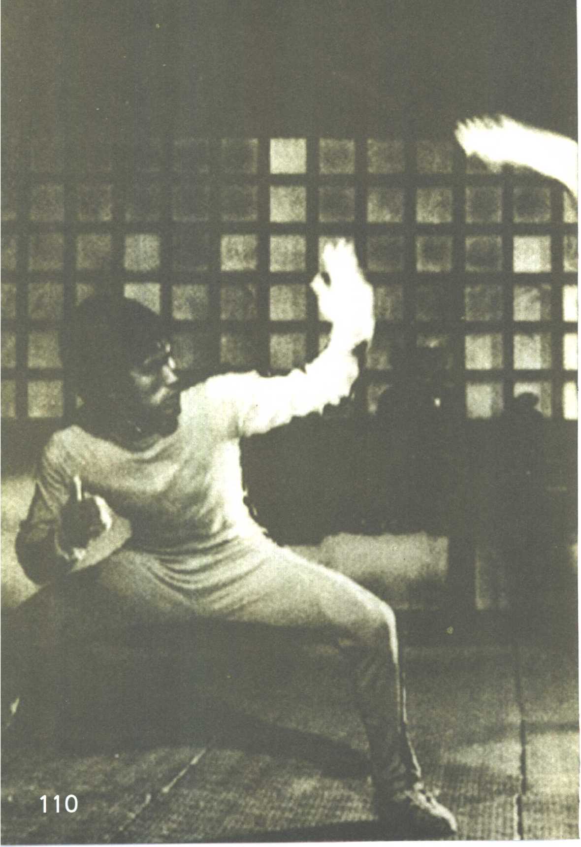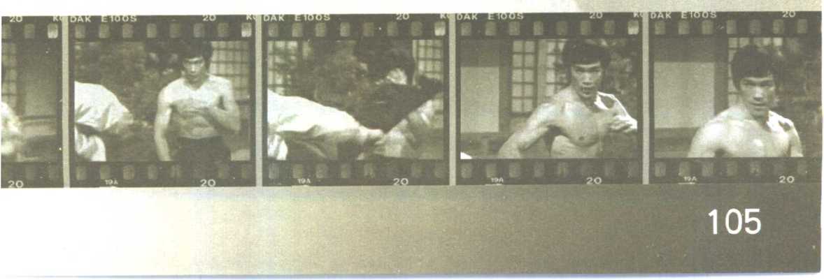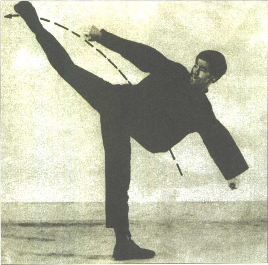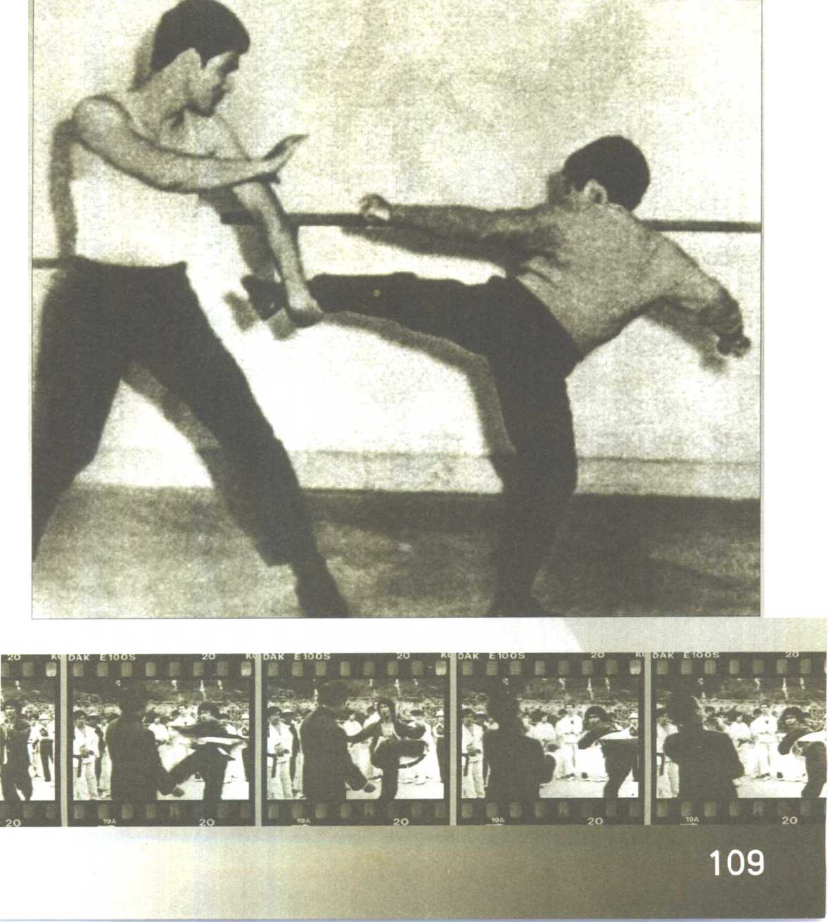 (1 )至(3 ),李小龙示范以一记勾踢。他先以一记假的低踢作佯攻, 然后突然改变方向往高处踢,对手头部中招。