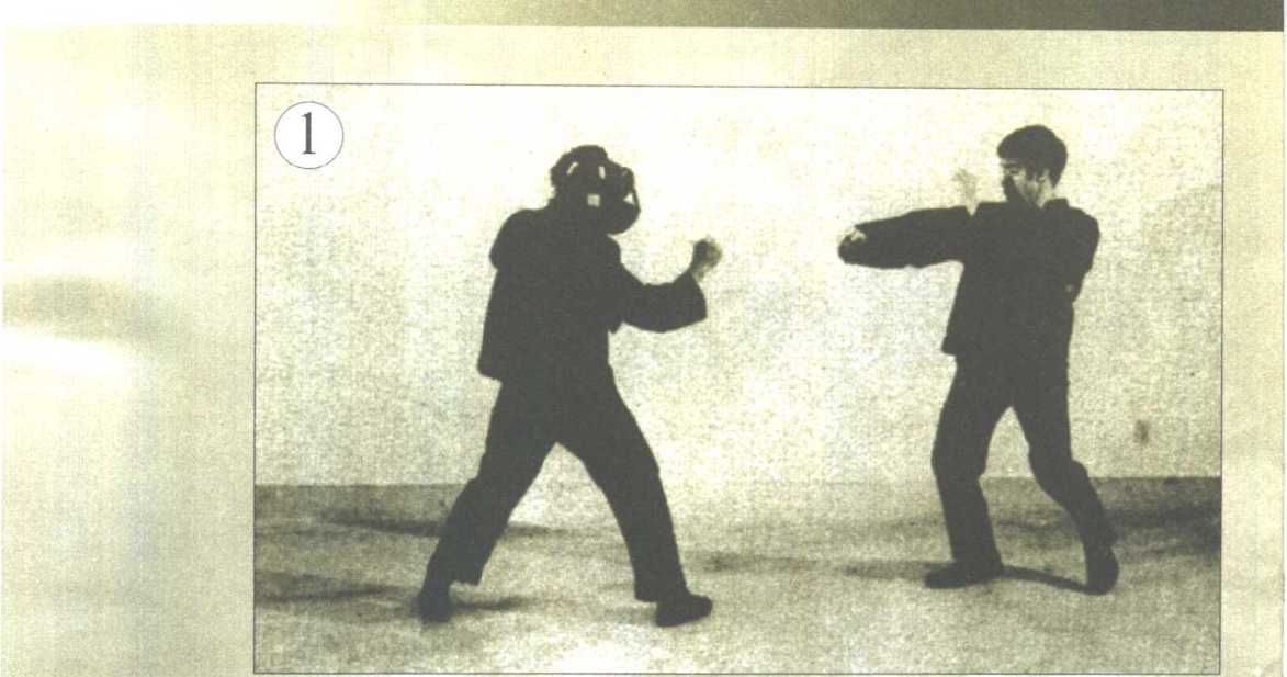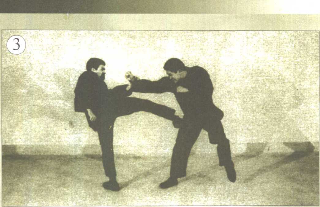 ⑴至⑶,李小龙示范一记低段扫踢,他先截着对方的来拳,同时使 出一记扫踢重击其阴部要害。