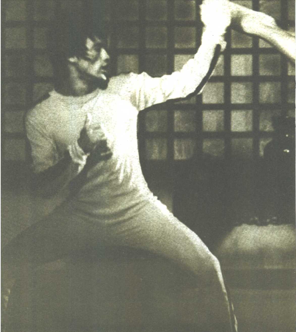 图为李小龙正教导一位小朋友功夫。李小龙把他的扫踢顺势一拨, 威力尽消。