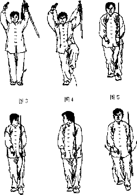 两者分经并右向上伸举经头上方向前徐徐卜落重心检至右腿左腿屈膝徐徐向前上亮起两营内旋使剑柄朝下徐徐下我南虎相苛落至腹前剑指朝下,