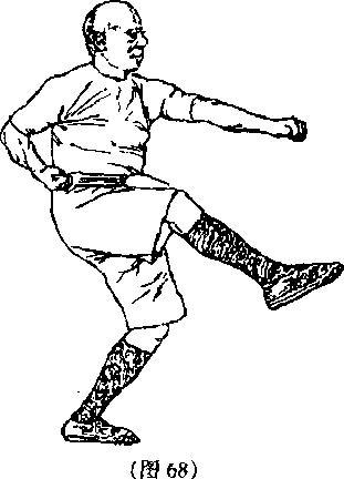 虎踢脚法乃出拳踢脚之势口一般出左拳则踢右脚出右拳则踢左脚。见虎鹤双形拳中之龙藏虎跃一式(图68)口功用此势主练拳打脚踢上下齐攻之法。练法悬吊一沙包不断出拳起脚踢打0踢脚以瞄准裆部为要。 、