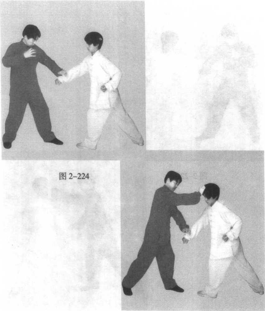 实战应用:1.左势对敌。2,敌向我打来,我先用左爪,砸臂破开(图2-224 )。 ■第二章虎拳技击法第二章虎拳技击法3.快速反击,再用右爪,猛劲抓拉敌头发(图2-225 )。第二章虎拳技击法第二章虎拳技击法