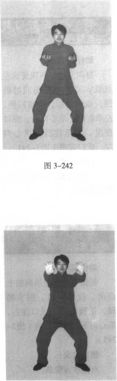 动作说明:身正直立,双腿并齐, 膝节伸直,脚尖外分;双臂 下垂,置于两腿外侧,手为 掌型,掌指向下,掌心向 内,贴靠腿边;准备开拳 (图 3—241 )。技击含义:以静制动,审时度势。技击含义:以静制动,审时度势。二、黑虎蓄爪势 正坐双提)二、黑虎蓄爪势 正坐双提)三、黑虎推山雪 正坐双推)三、黑虎推山雪 正坐双推)第三章虎拳拳法第三章虎拳拳法技击含义:以静制动,审时度势。技击含义:以静制动,审时度势。
