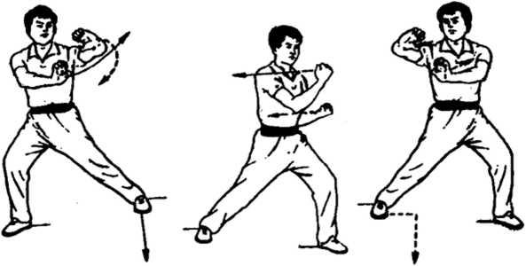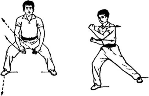 技击要领:上步以双拳格挡对方来拳。要求左腿借上步之势, 挺膝伸直,拧腰挣胯;发力刚猛,带有爆发力。