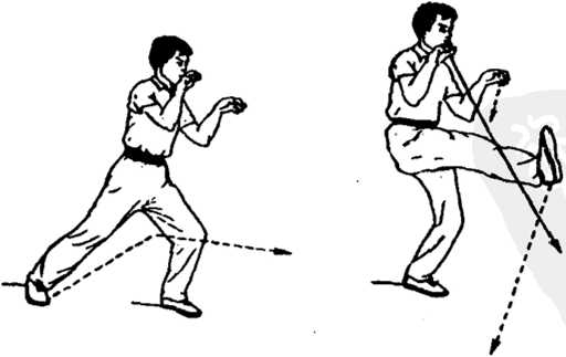 技击要领:左转身,以双掌搭住对方两臂,迅起右脚蹬■踢其 胫骨或裆部。注意屈膝、收腹,重心要稳。