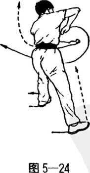 转体之势朝左横打;左虎掌在胸前向左、向下、向右翻掌划一小 弧,使掌心朝上。两虎掌掌心上下相对。眼看右虎掌。〈图5—24) 技击要领:右肘横击对方脑门。打肘须借助拧腰发劲