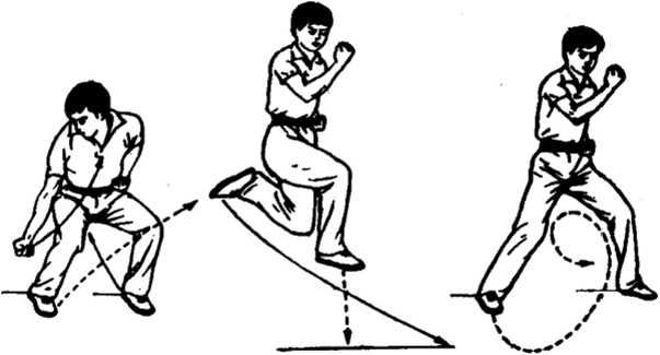 技击要领:右脚勾扫对方前脚。注意左膝略屈,重心要稳,五 趾抓地。