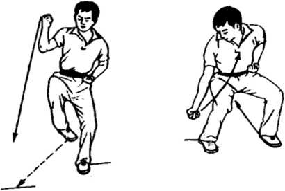 技击要领:右脚下落,插到对方身后,右拳砸其胭窝处。要 求沉气下蹲,两脚落地生根,气沉丹田。