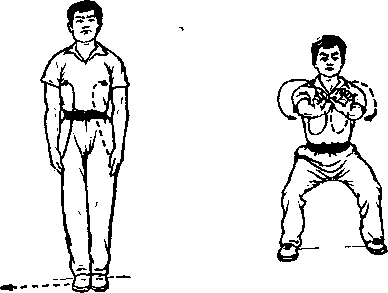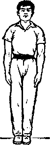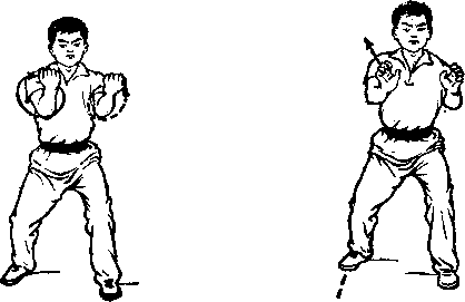 双膝挺直,右脚收回,向左脚靠拢,并步立正。两手五 指并拢,直臂,贴靠于两腿外侧。两眼平视。(图39)