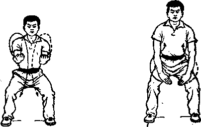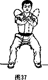 右脚后退一步,与左脚平行(稍 宽于肩),两腿屈膝,半蹲成马步。 与此同时,左虎掌前臂内旋,屈肘上 提,收于胸前;右虎掌下落,双掌拇 指相扣,向前推出。两肘略屈,双掌 掌指高同胸,掌心朝前。眼看两掌。 (图37)技击要领:与动作一的技击要领图36①图祁②图36③相同。