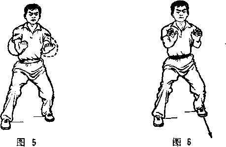 枝击要领:与动作三一的技击要领相同。唯左右方向相 反。