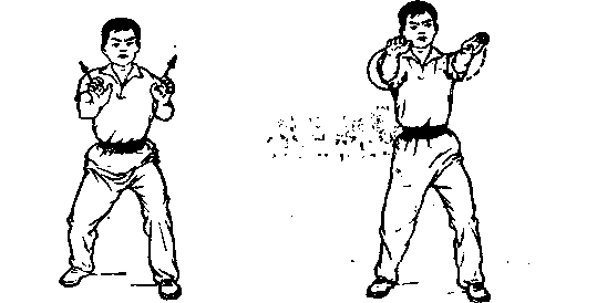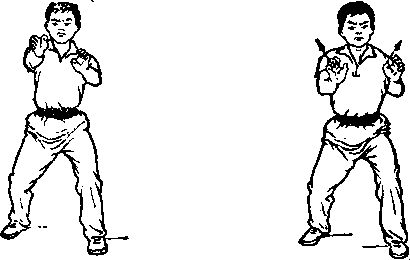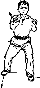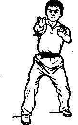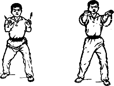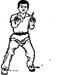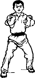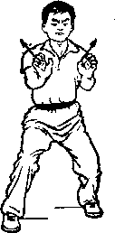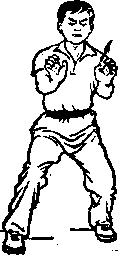 技击要领:用双掌(排指掌)掌指插击对方胸、扃部。 插掌与右脚猛力蹬地应同时完成,插掌时须配合吐气用劲。