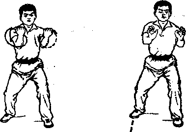 技击要领*当对方用拳掌向我正面攻击时,我迅疾向左 转身以两掌分别左格、右按,阻挡其攻势,并随即上步逼远