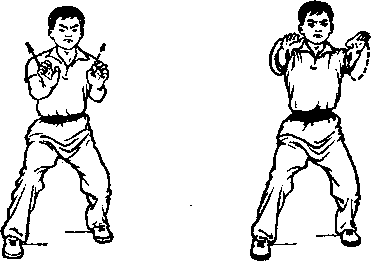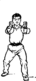 紧接上动,脚步芣变。两前臂内旋,双排指掌同时内 旋,并变回虎掌,略屈肘,两掌停于胸前。双掌掌指朝上,
