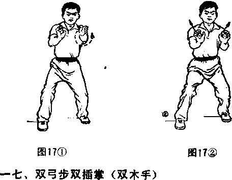 脚步不变。两虎掌变排指掌,两虎口朝上,直臂,猛 力向前插出,高与肩平。左右两掌掌心相对,拿指朝前。两 臂相距与肩同宽。力达指端。眼看两掌。(图18①)