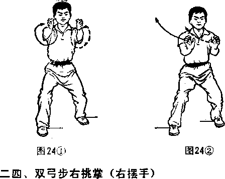 图23②二三、双弓步双插掌(双木手)此动动作及技击要领与动作—t相同。(图24①@)脚步不变,上体稍右转。与此同时/两虎掌变排指掌向 右上方挑掌。左臂平屈,停于胸前,左掌靠近右肩,掌心朝 下,掌指朝右;右臂屈肘于右肋外,右掌高与鼻平,掌心朝 上,掌指朝右。眼看右掌。(图25)