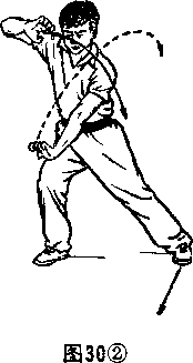 起,屈肘停于右肩前,掌心朝前,掌指朝左。上体前倾。眼 看左掌。(图30②)