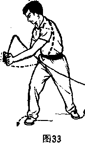 紧接上动,脚步不变,上体右转。左排指掌变成虎掌, 屈肘上提,于胸前;右虎掌随即经胸 前下落,双掌一起向体前右下方猛力 推出,停于右胯前,力达两掌根。两 掌心均朝前,掌根相向,掌指分向左 右两边。上体稍前俯,眼看两掌。 (图 33)