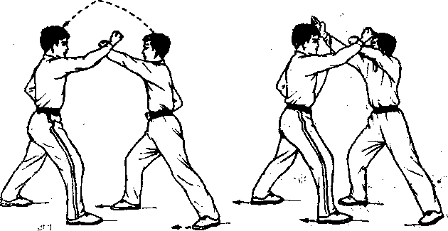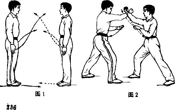 ②甲、乙双方各迈右脚向前上一步,右腿屈膝半蹲;左 腿挺膝伸直成右弓步。同时,右掌变拳向左、向前、向上、 向右划弧外格相靠,停于胸前,肘略屈,力达桡骨一侧,左 掌变虎掌,屈肘向前推按,停于左胸前,掌心朝下。双方两 眼均看右拳。(图2)