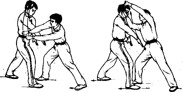 虎形五步头对练,是指进攻的一方必须向前进五步,防 守一方必须向后退五步。本书中,甲、乙双方各进攻和防守 一趟后即还原成预备式。实际练习时,读者也可根据自己的 训练水平和体质,逐步增加攻防的趟次。