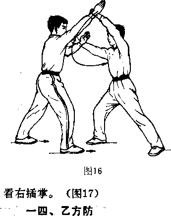 间向上架起,挡开甲方 劈掌,力达尺骨一侧。 眼看甲方右掌。(图 16)