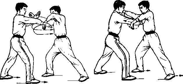 挡开乙方劈掌,力达尺骨一侧。眼看乙方右掌。(图5)