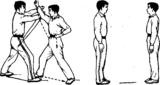 ①甲、乙双方相距三步,面相对,双手五指并拢,直臂 贴靠两腿外侧,成并步站立。双方两眼对视。(图1)