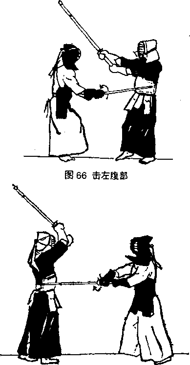 击腹部时应注意左拳高度在腰部而且不脱离身体中心线,如果左拳在比右手-较高的位置时竹剑击刺部即过降低容易击打对方足部