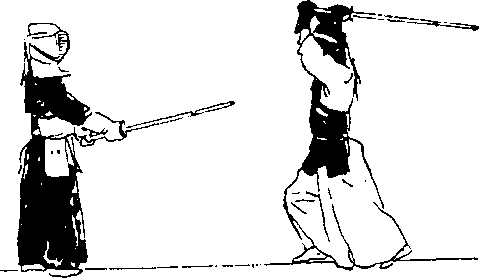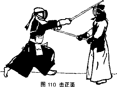 以远距离取中段姿势攻一步从里把对方竹剑向对方左上方打开(守方稍退)趋势挥举竹剑击下正面部(守方稍退任其击打)