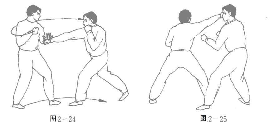 此时,我身体一旦发动旋转,便不停顿,以左脚掌为轴,右转体 180。,同时发右鞭手,好像一条鞭子似的,狠狠抽击对手的后 颈脖!(图 2—23、24、25)